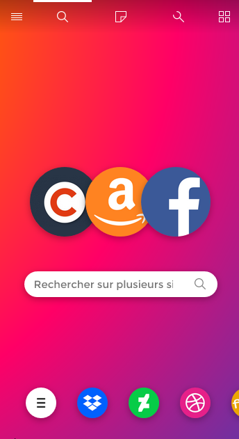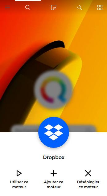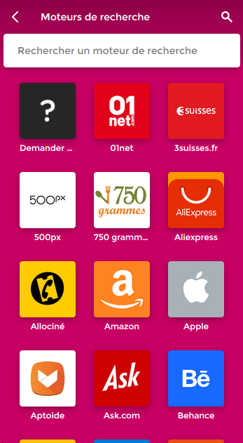 Pour sélectionner un moteur de recherche, cliquez sur le bouton menu en bas de l'écran et la liste des moteurs disponible apparaitra.